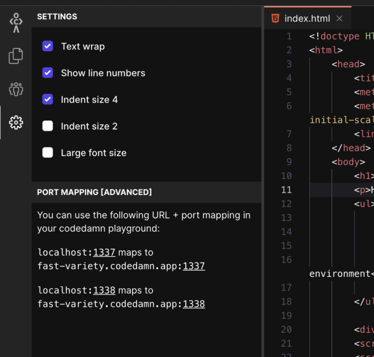 Every time you boot a playground, you get a unique hostname assigned to you (example: hello-world.codedamn.app)