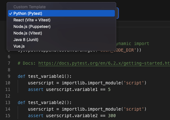 USER_CODE_DIRto thePATHenv.USER_CODE_DIRstring is effectively/home/damner/codewhich in turn is the directory where your students store their coding files (and is also visible in the playground file explorer by default) - We start writing tests on how Python pytest library recommends. Check out pytest documentation for more information.